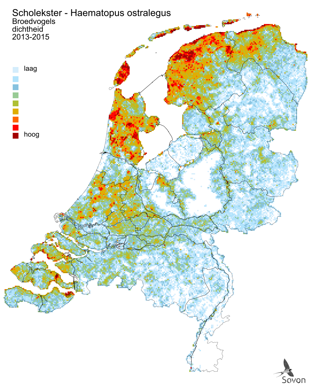 Deze kaart is gebaseerd op de Vogelatlas van Nederland (Sovon 2018). Weergegeven is de relatieve dichtheid per vierkante kilometer.