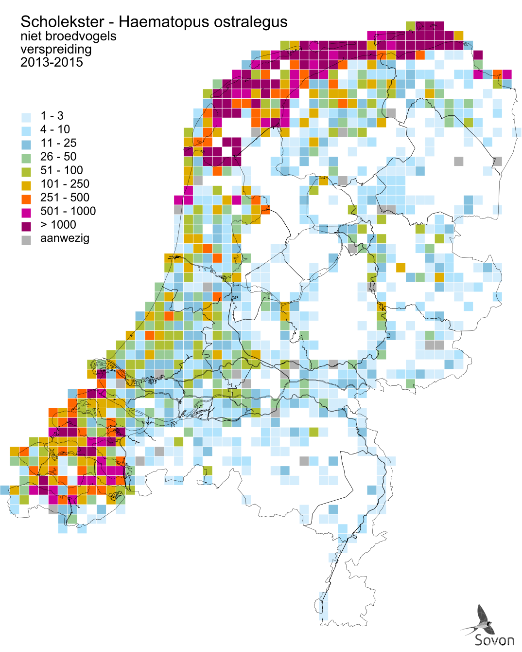 Deze kaart is gebaseerd op de Vogelatlas van Nederland (Sovon 2018). Per atlasblok van 5x5 km is er een schatting van het aantal individuen gegeven.