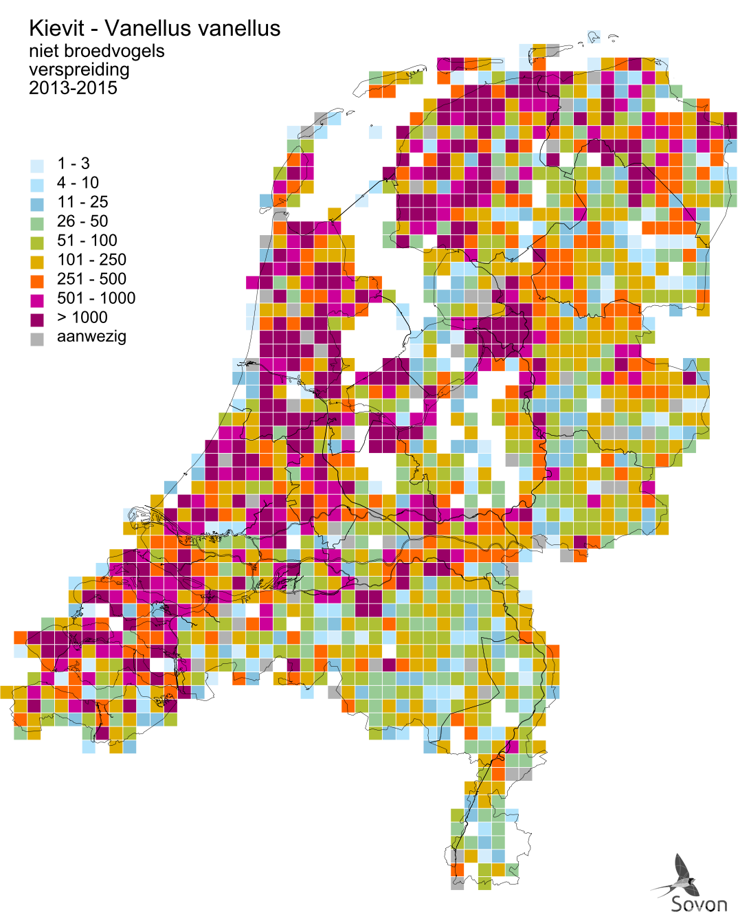 Deze kaart is gebaseerd op de Vogelatlas van Nederland (Sovon 2018). Per atlasblok van 5x5 km is er een schatting van het aantal individuen gegeven.