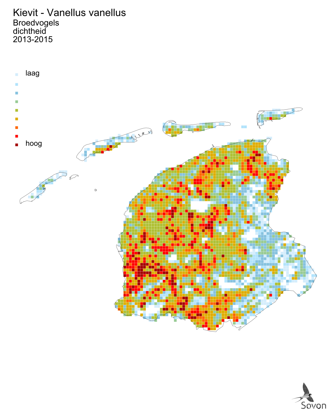 Deze kaart is gebaseerd op de Vogelatlas van Nederland (Sovon 2018). Weergegeven is de relatieve dichtheid per vierkante kilometer.