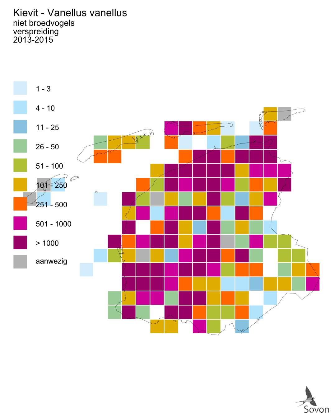 Deze kaart is gebaseerd op de Vogelatlas van Nederland (Sovon 2018). Per atlasblok van 5x5 km is er een schatting van het aantal individuen gegeven.
