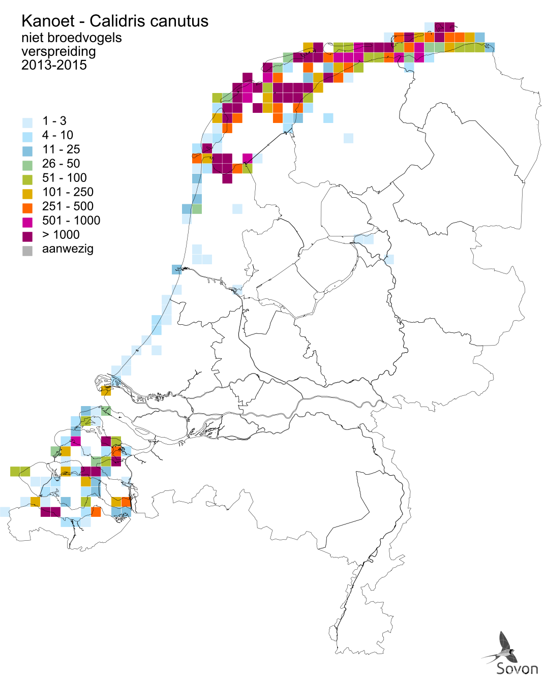 Deze kaart is gebaseerd op de Vogelatlas van Nederland (Sovon 2018). Per atlasblok van 5x5 km is er een schatting van het aantal individuen gegeven.
