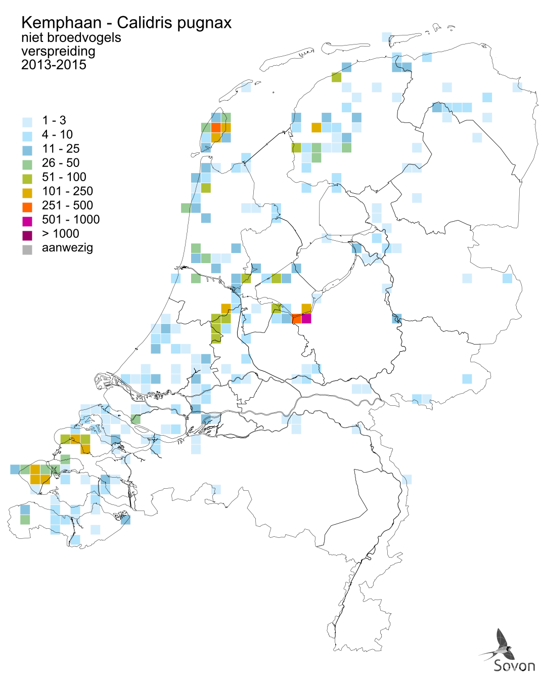 Deze kaart is gebaseerd op de Vogelatlas van Nederland (Sovon 2018). Per atlasblok van 5x5 km is er een schatting van het aantal individuen gegeven.