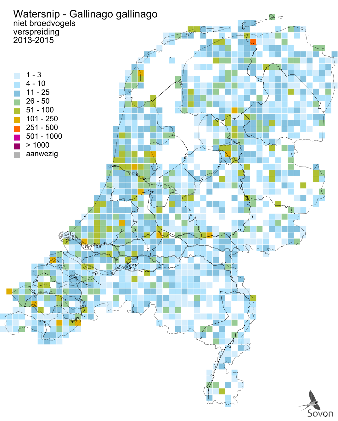 This map is derived from the Bird Atlas of the Netherlands (Sovon 2018). For each atlas square of 5x5 km, an estimate for the number of wintering birds is given.