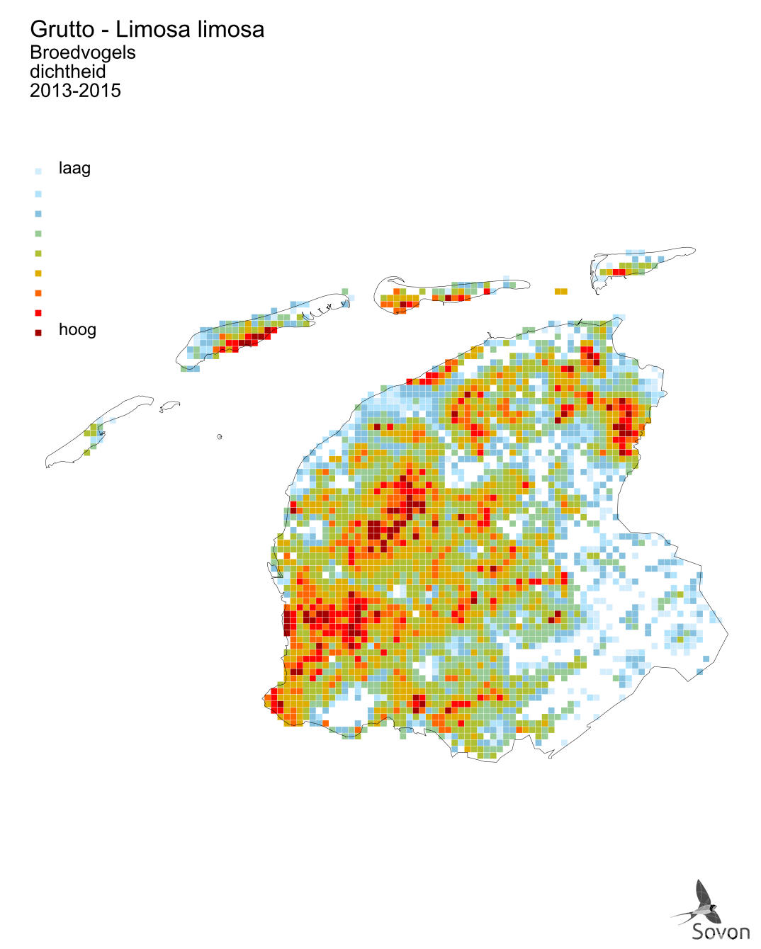 Deze kaart is gebaseerd op de Vogelatlas van Nederland (Sovon 2018). Weergegeven is de relatieve dichtheid per vierkante kilometer.