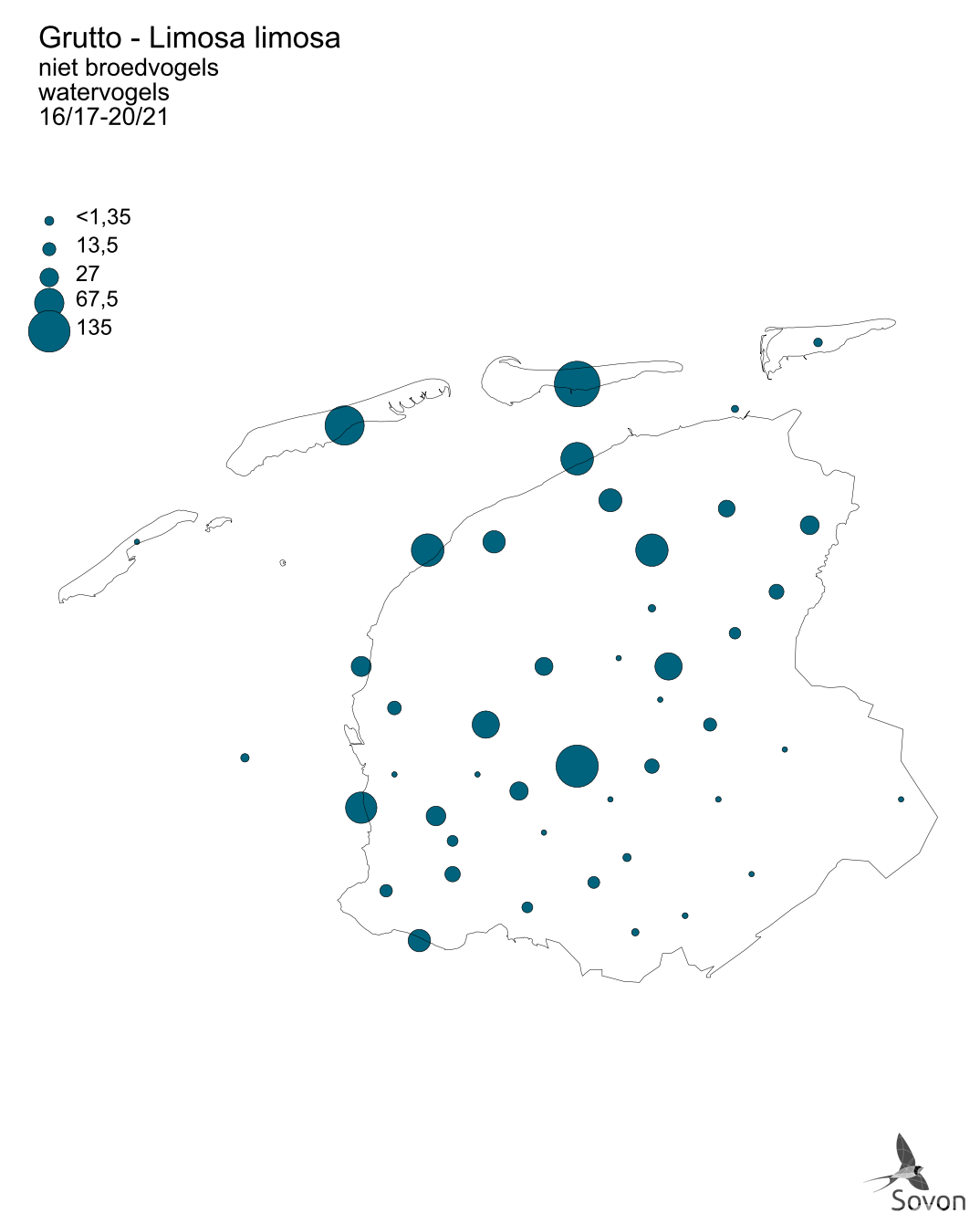 Deze kaart is gebaseerd op het Meetnet Watervogels (seizoen juli t/m juni). Weergegeven is het gemiddelde seizoensgemiddelde (exemplaren) per (hoofd)telgebied.
