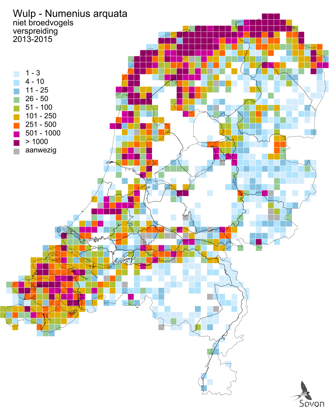 Deze kaart is gebaseerd op de Vogelatlas van Nederland (Sovon 2018). Per atlasblok van 5x5 km is er een schatting van het aantal individuen gegeven.