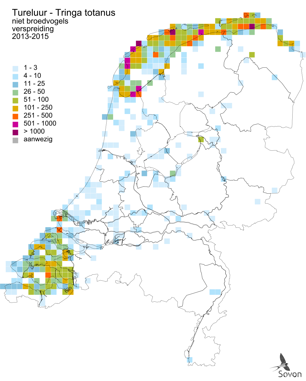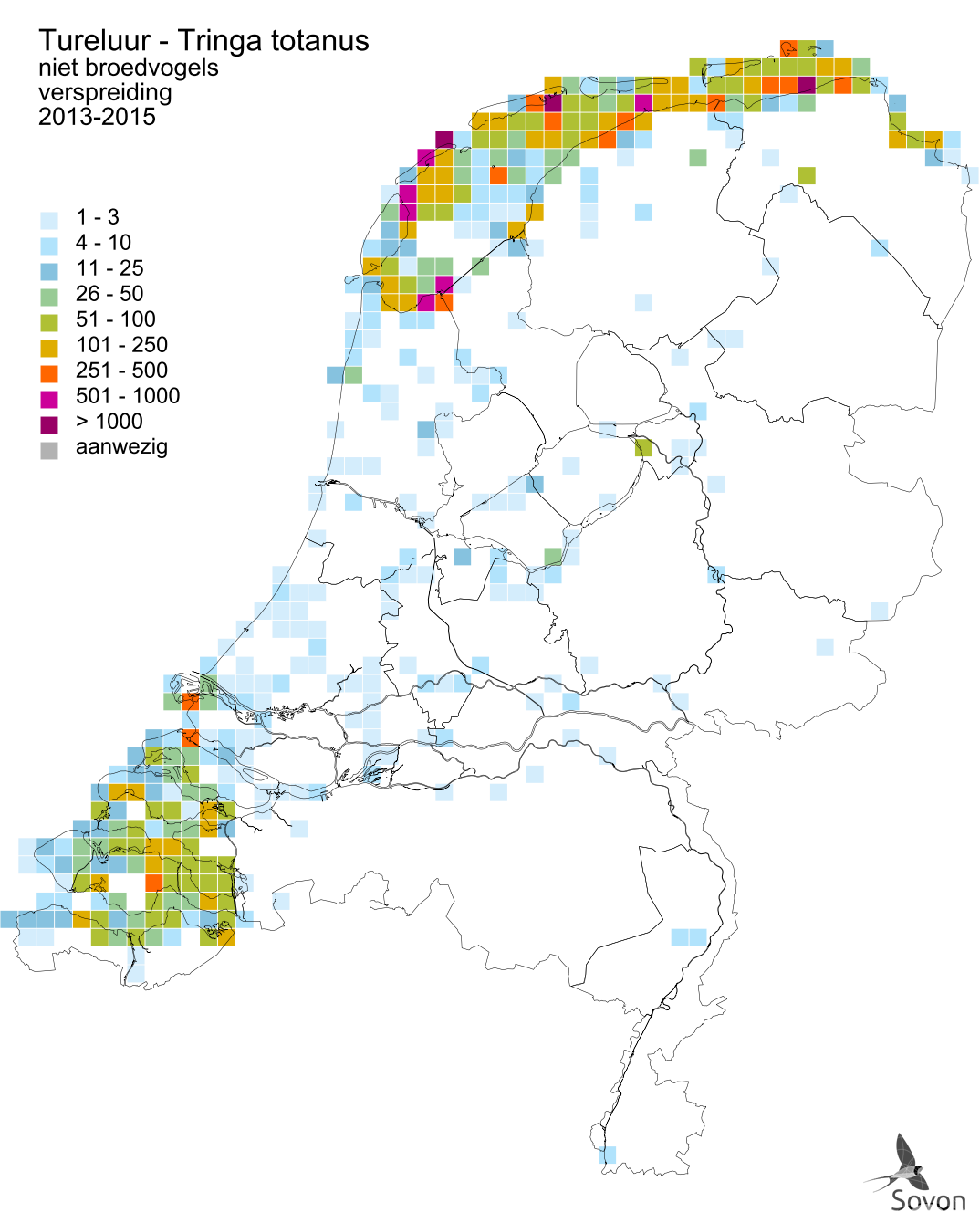 LET OP: doortrek tot eind april of later, maar doortrekkers verblijven in groepjes en tonen geen terreinbinding [niet invoeren]. Observatie van afstand (voor veel steltlopers een goede methode om indruk te krijgen van aantal broedparen) is bij Tureluur minder werkzaam vanwege formaat, onopvallende kleuren en voorkeur voor hogere vegetaties. Houd er rekening mee dat broedende vogels zich kunnen drukken op het nest. In onoverzichtelijk terrein is vooral het moment waarop de jongen uitkomen (half mei) een geschikte telperiode, omdat dan vaak beide ouders paarsgewijs alarmeren bij betreding van het nestperceel en de jongen zich nog niet ver van het nest hebben verwijderd. In gebieden met extreem hoge dichtheden (o.a. delen Waddengebied) is gebruikelijke kartering onmogelijk. Dan alle vogels in broedgebied tellen (zowel zittende als vliegende) en delen door 1,5 [invoeren als losse stippen met broedcode 3].