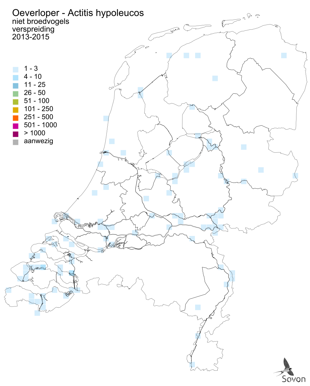 Deze kaart is gebaseerd op de Vogelatlas van Nederland (Sovon 2018). Per atlasblok van 5x5 km is er een schatting van het aantal individuen gegeven.