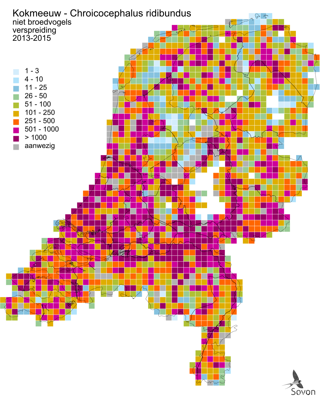 Deze kaart is gebaseerd op de Vogelatlas van Nederland (Sovon 2018). Per atlasblok van 5x5 km is er een schatting van het aantal individuen gegeven.