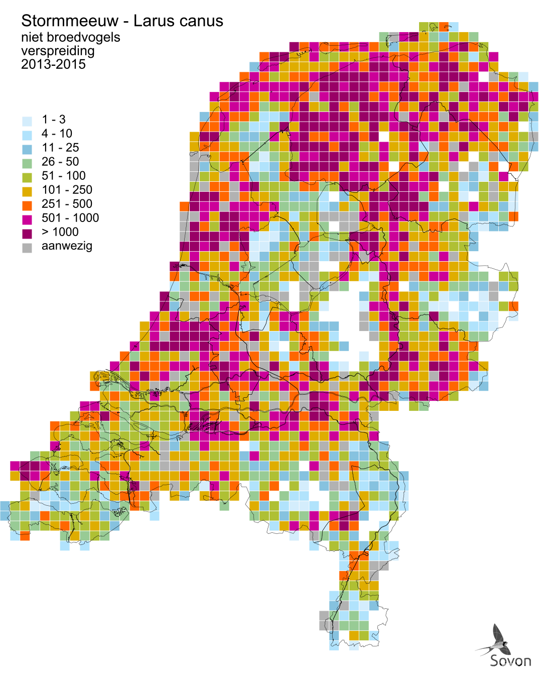 Deze kaart is gebaseerd op de Vogelatlas van Nederland (Sovon 2018). Per atlasblok van 5x5 km is er een schatting van het aantal individuen gegeven.