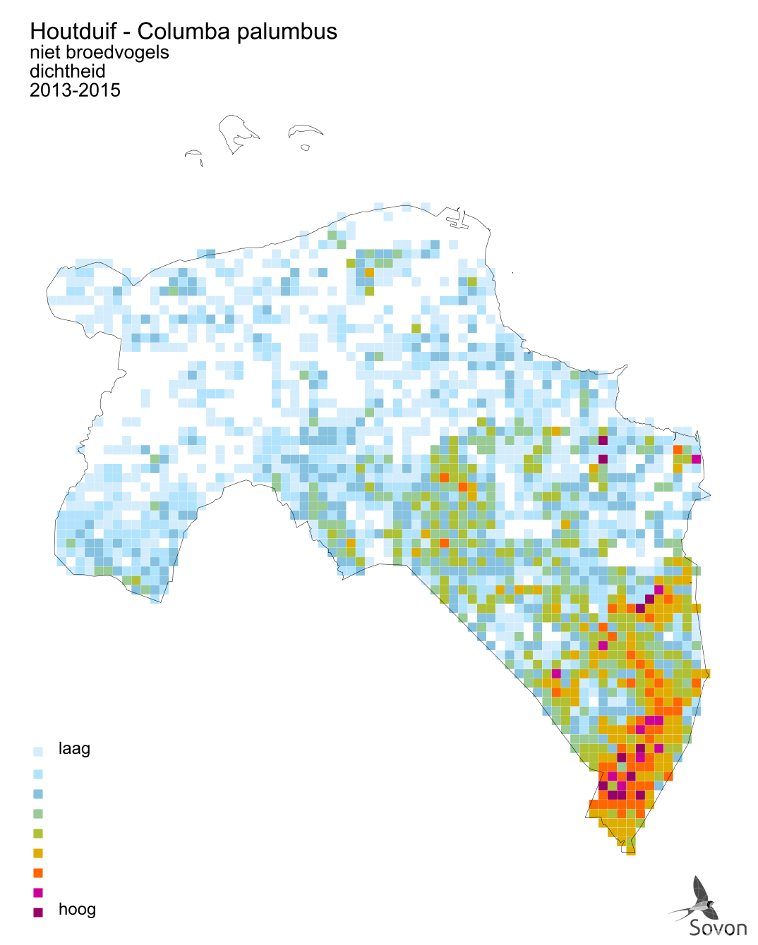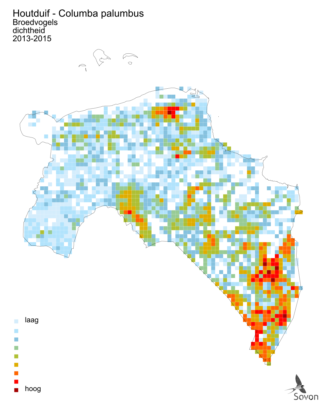 Deze kaart is gebaseerd op de Vogelatlas van Nederland (Sovon 2018). Weergegeven is de relatieve dichtheid per vierkante kilometer.