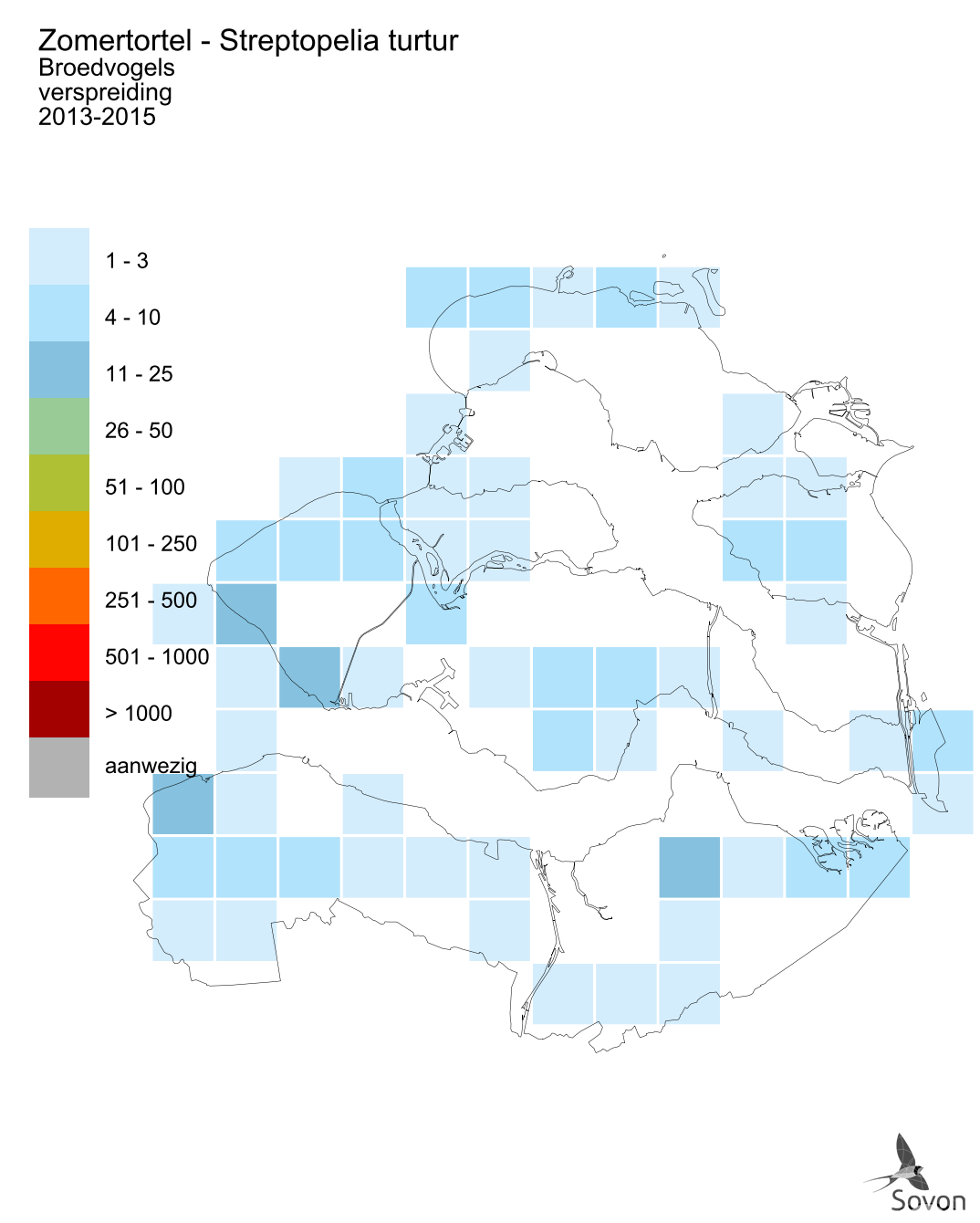 Deze kaart is gebaseerd op de Vogelatlas van Nederland (Sovon 2018). Per atlasblok van 5x5 km is er een schatting van het aantal broedparen gegeven.