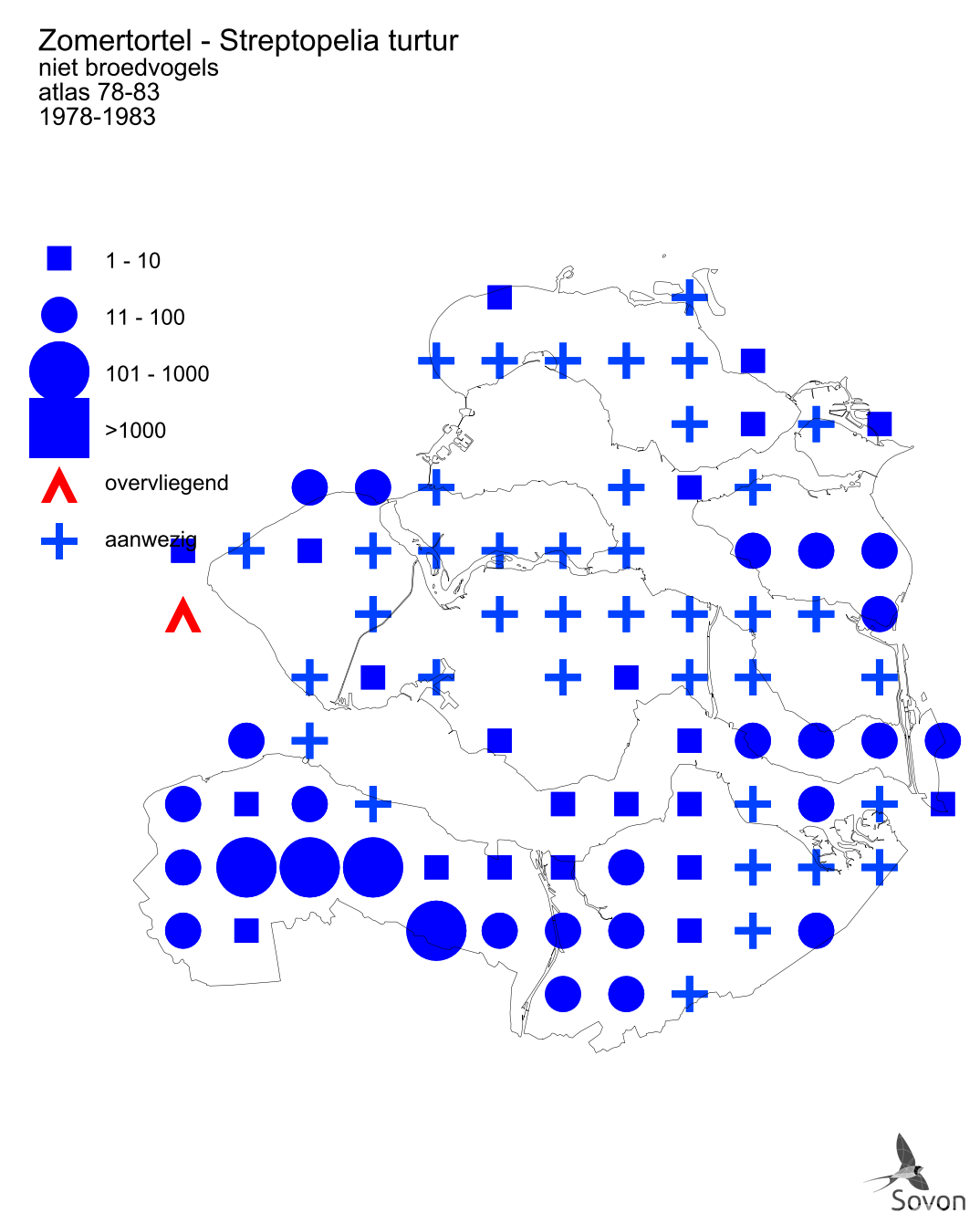 Deze kaart is gebaseerd op de Atlas van de Nederlandse Vogels (1987). Per atlasblok van 5x5 km wordt een schatting van de aanwezige aantallen gegeven.