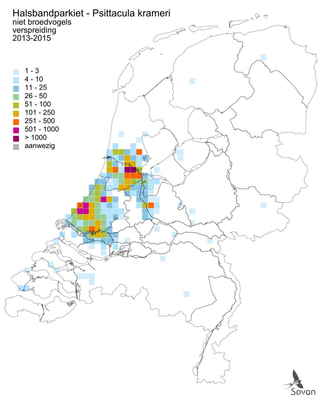 Deze kaart is gebaseerd op de Vogelatlas van Nederland (Sovon 2018). Per atlasblok van 5x5 km is er een schatting van het aantal individuen gegeven.
