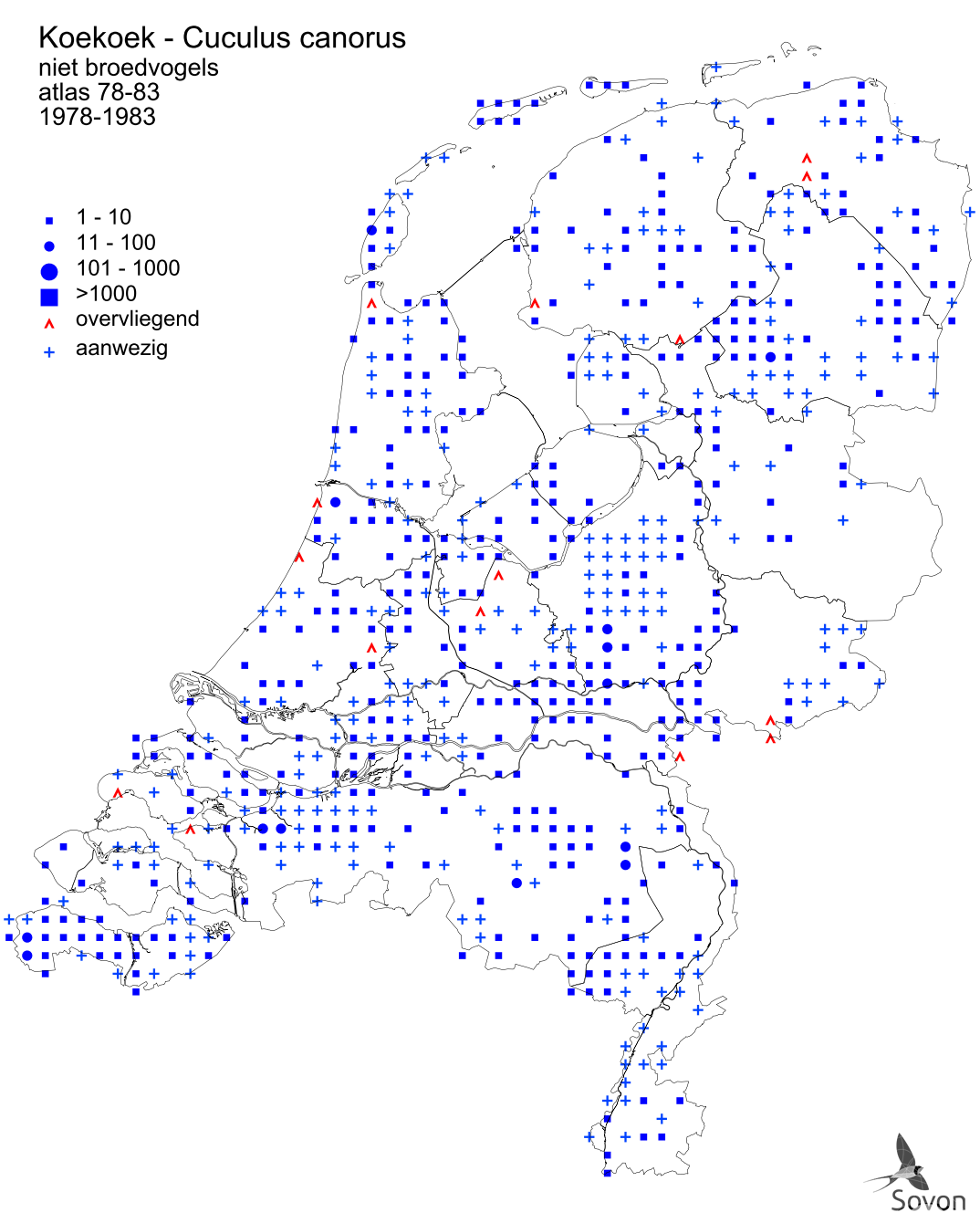 Deze kaart is gebaseerd op de Atlas van de Nederlandse Vogels (1987). Per atlasblok van 5x5 km wordt een schatting van de aanwezige aantallen gegeven.