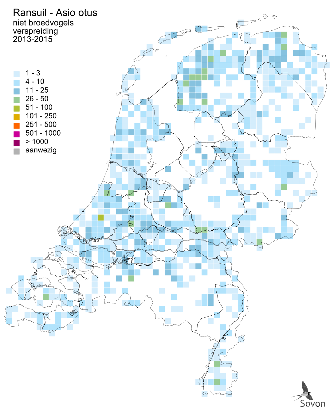 Deze kaart is gebaseerd op de Vogelatlas van Nederland (Sovon 2018). Per atlasblok is aangegeven of de soort er voorkomt en welke zekerheid omtrent broeden werd verkregen.