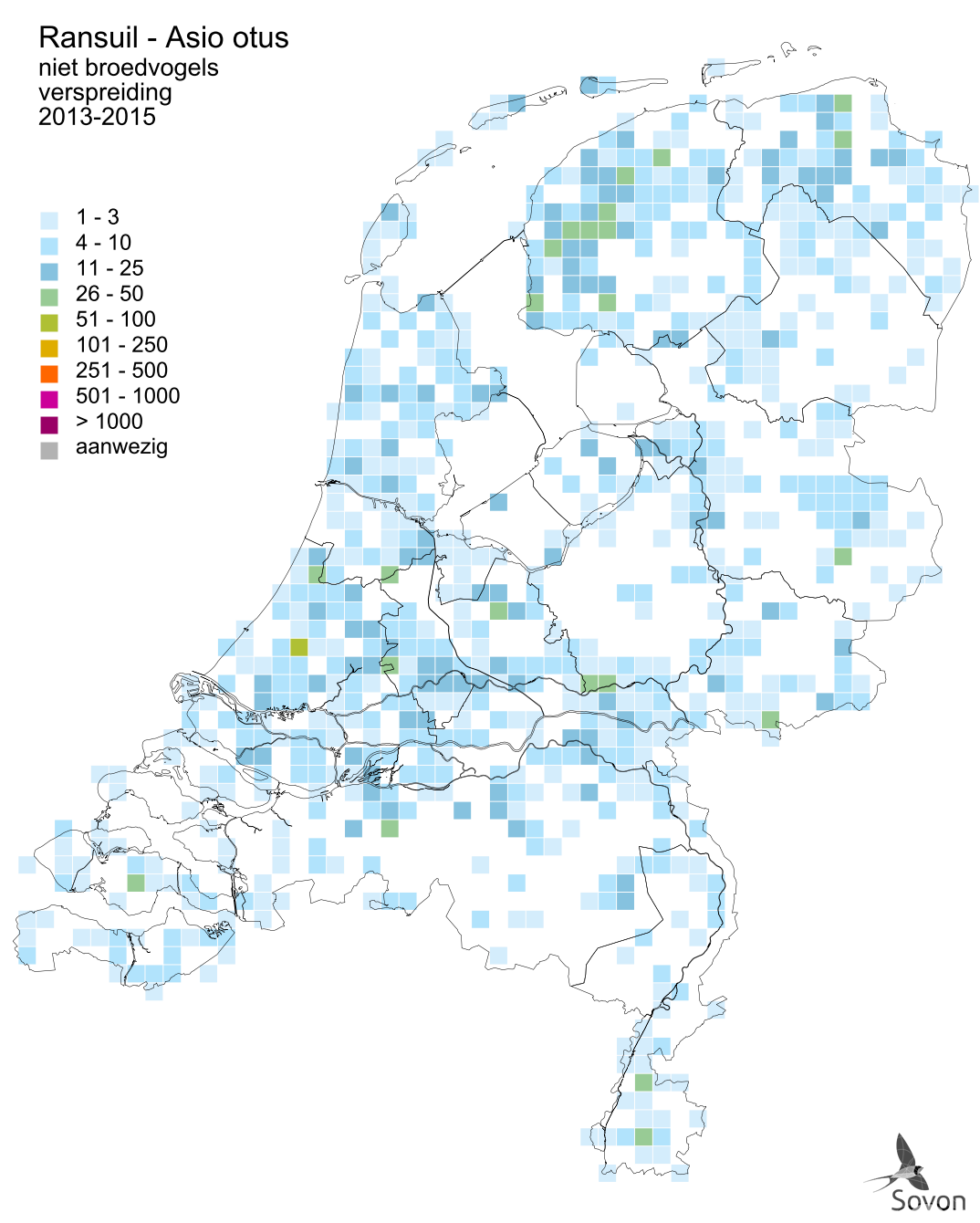Deze kaart is gebaseerd op de Vogelatlas van Nederland (Sovon 2018). Per atlasblok van 5x5 km is er een schatting van het aantal individuen gegeven.
