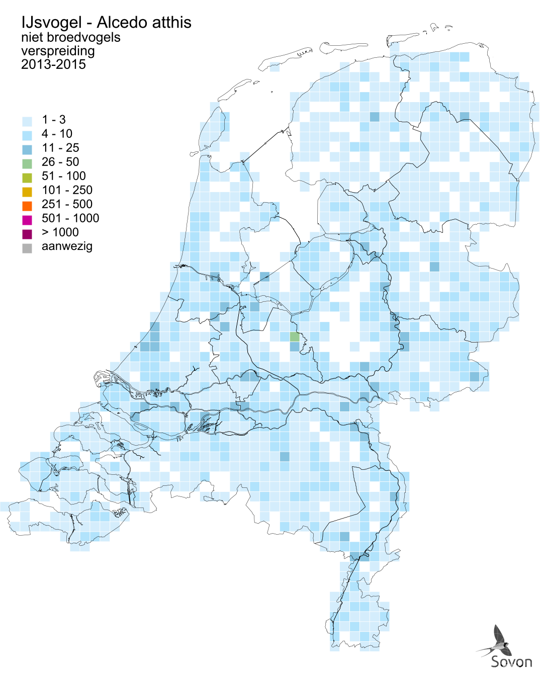 Deze kaart is gebaseerd op de Vogelatlas van Nederland (Sovon 2018). Per atlasblok van 5x5 km is er een schatting van het aantal individuen gegeven.