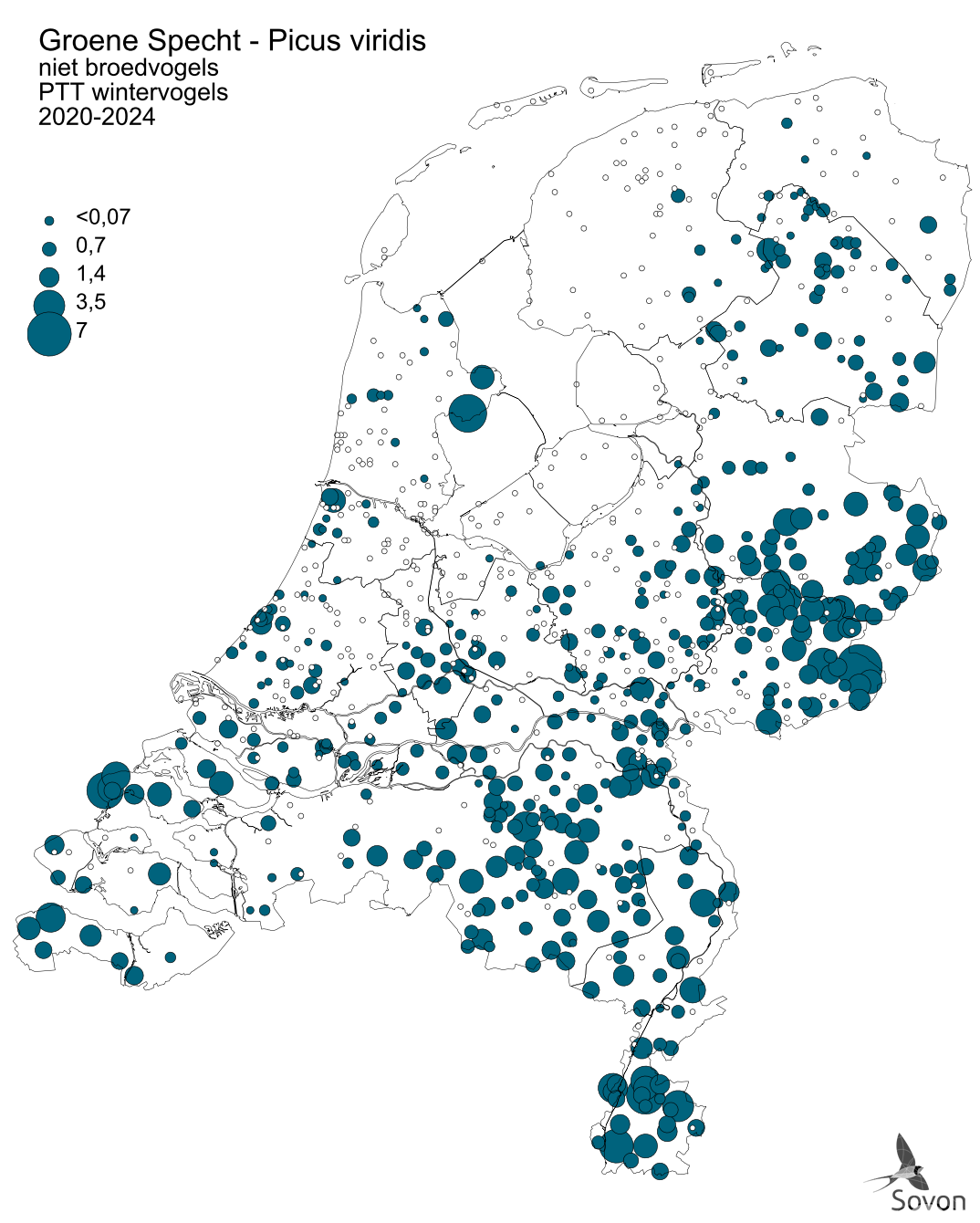 Deze kaart is gebaseerd op het Punt Transect Tellingen project (PTT). Weergegeven is het gemiddeld aantal exemplaren per telroute. Routes waar de soort niet is waargenomen zijn apart aangegeven (geen landelijke dekking).