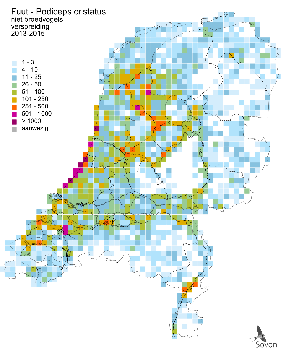 Deze kaart is gebaseerd op de Vogelatlas van Nederland (Sovon 2018). Per atlasblok van 5x5 km is er een schatting van het aantal individuen gegeven.