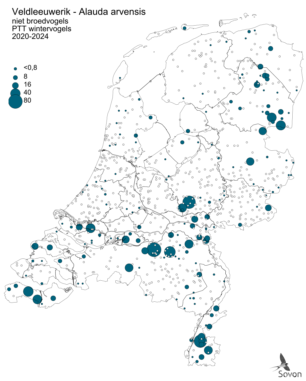 Deze kaart is gebaseerd op de Vogelatlas van Nederland (Sovon 2018). Weergegeven is de relatieve dichtheid per vierkante kilometer.