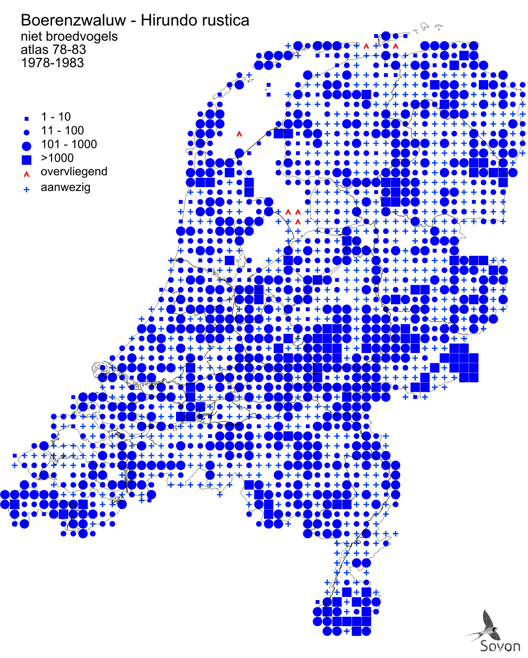 Tel rondvliegende vogels per broedplaats [broedcode 6] (schuur, stal enz.) eind mei en in juni (meeste vogels bezig met eerste broedsel). Twee tellingen geven beste indruk. Probeer zingende mannetjes [brc 2] (in vlucht of vanaf zitplaats) en vogels met nestmateriaal [brc 9] of uitwerpselen [brc 14] te onderscheiden. In slechtste geval: totaal aantal vogels tellen en delen door 2. Deze methode geeft slechts een vage indruk van het aantal broedparen.